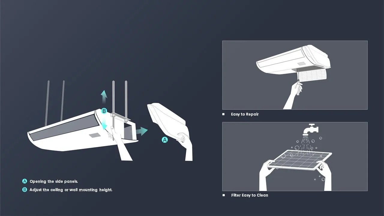 Lakke või seinale paigaldamise kõrgust saab reguleerida üksnes külgpaneelide avamisega, ilma et oleks vaja ligipääsu sisemistele osadele.Hooldusavad pole elektrikarbi lihtsa disaini tõttu vajalikud.